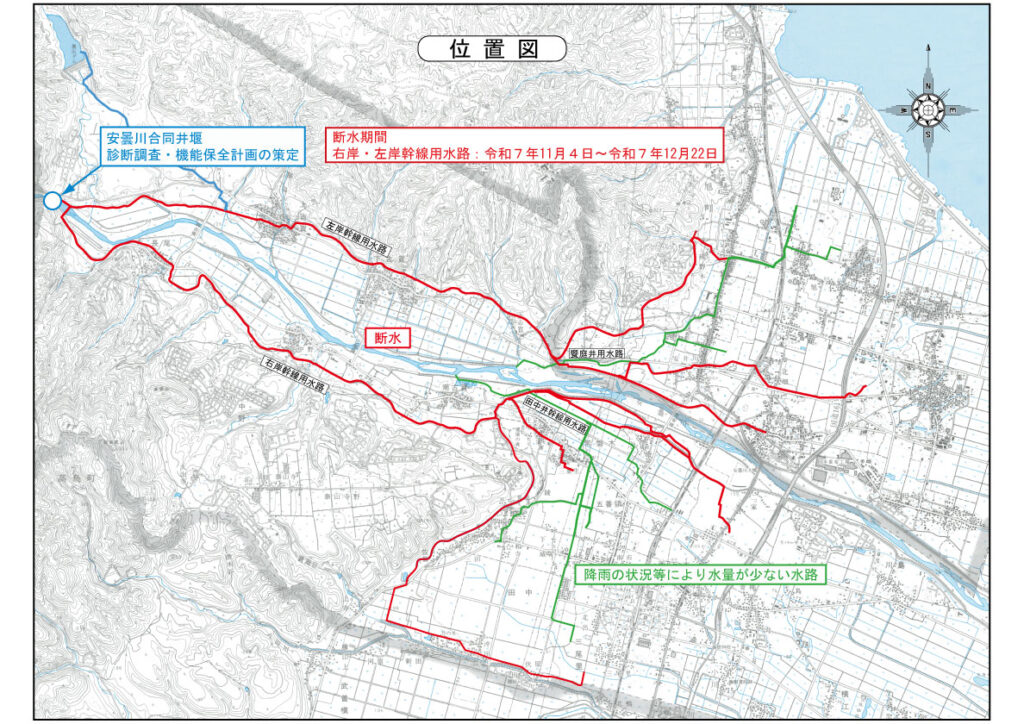 安曇川合同井堰の診断調査のため、令和7年11月4日から令和7年12月22日まで断水となります。