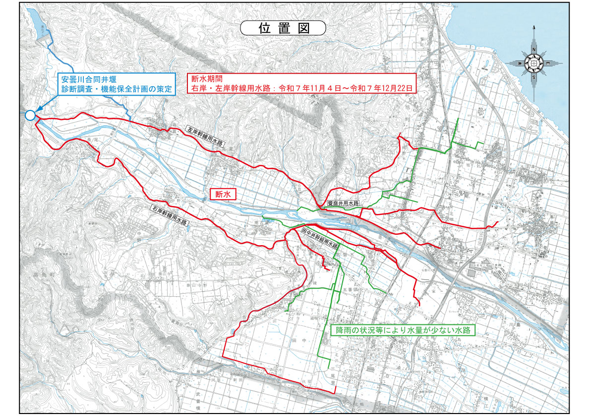 令和7年11月4日から令和7年12月22日まで、安曇川合同井堰の診断調査のため幹線用水路が断水となります。