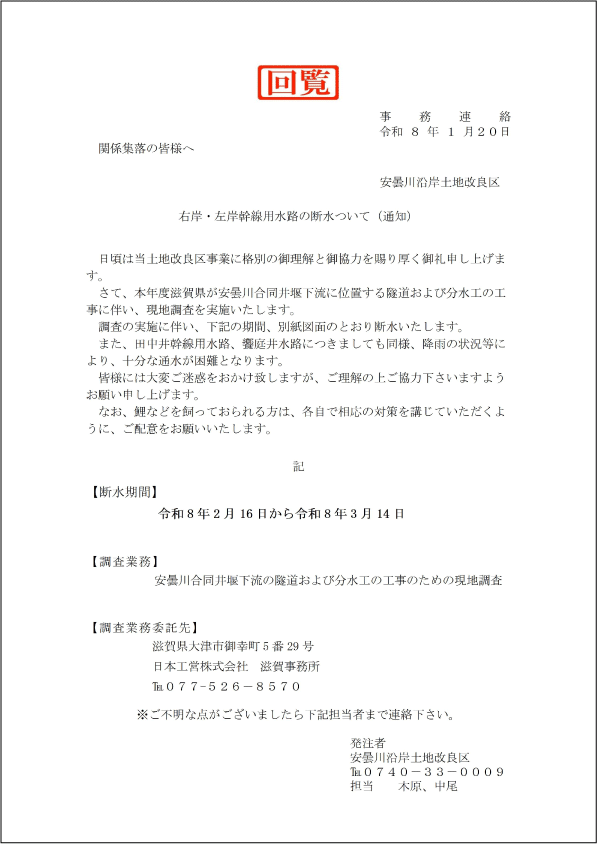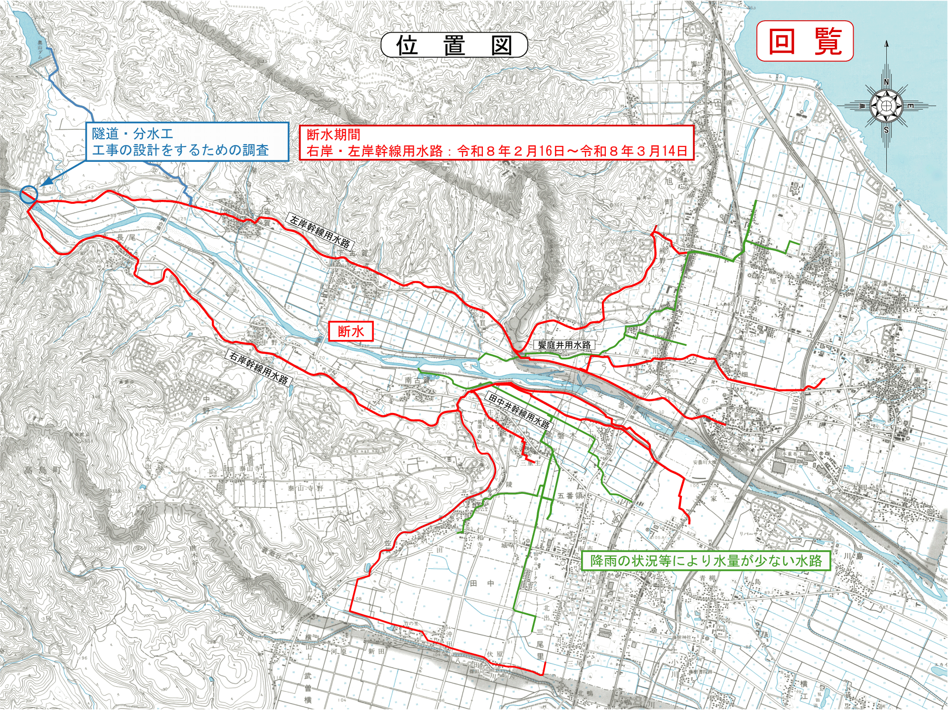 令和8年2月16日~3月14日まで右岸・左岸幹線用水路が断水となります。